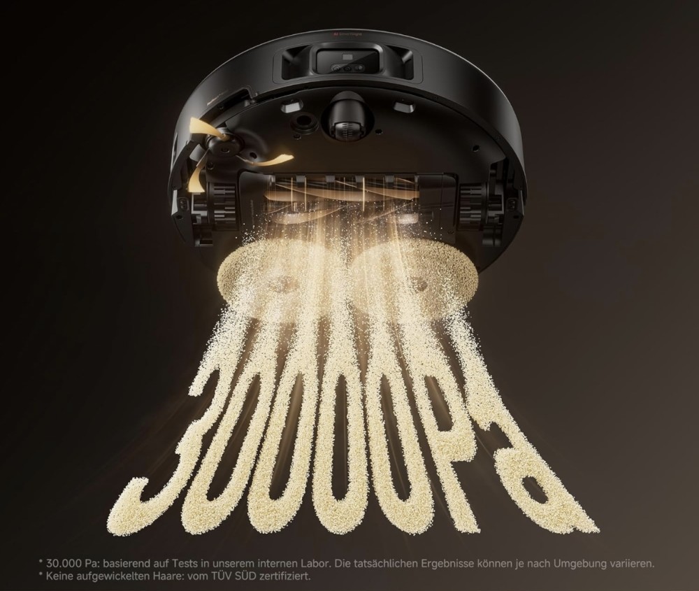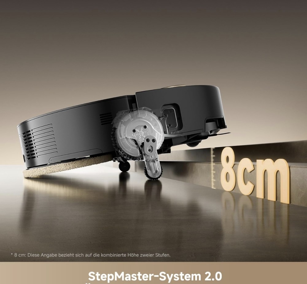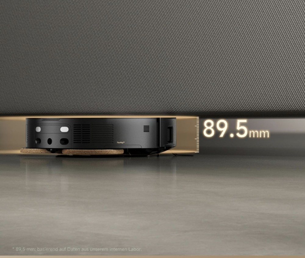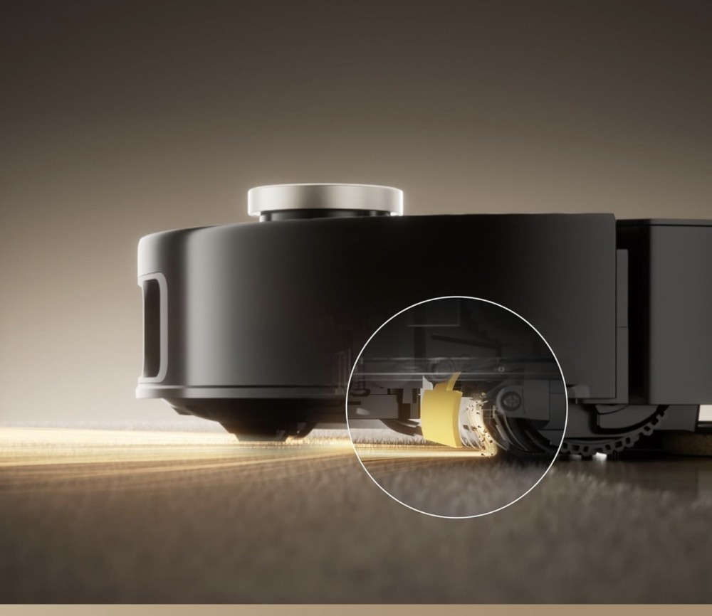 The smart features don’t stop with the mop system the robot itself has some really clever upgrades. It can climb over obstacles up to 8 cm, so small steps or higher thresholds are no problem. The suction is very strong at 30,000 Pa, which helps it pick up dust, pet hair, and dirt with ease. When it rolls onto a carpet, a small flap underneath lifts up and creates a tighter seal. This gives much stronger power on the carpet for a deeper clean. The mops can also “float” a little, about 5 degrees, which helps them follow uneven or older wooden floors so the mopping stays even everywhere.
