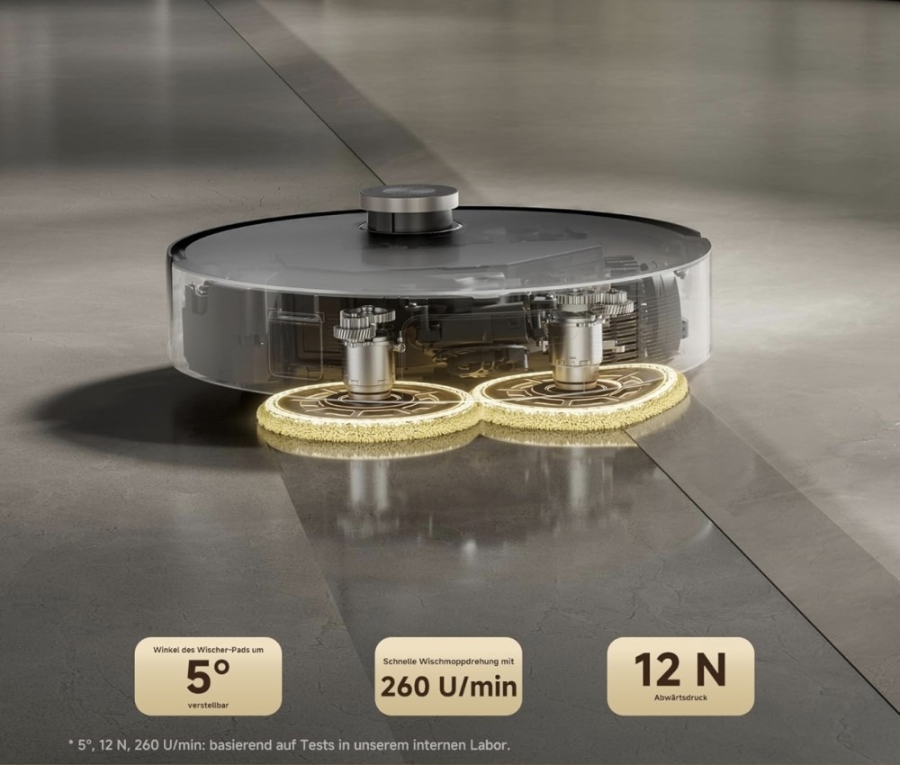 The base washes the mops with 100°C hot water, which helps remove grease and tough dirt in places like the kitchen and bathroom. In the app, you can also choose which mop each room should use, which makes everything much easier.The base station is a little big, but it looks modern and stylish, so it still fits nicely in the home.
