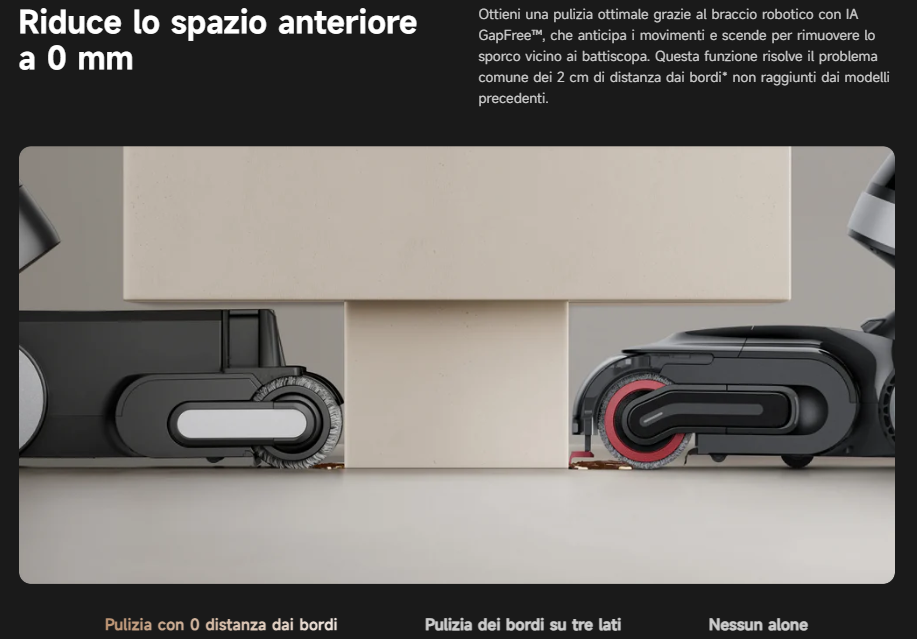 I also point out two factors to consider: first, the rubber scraper of the robotic arm does not self-clean, so it must be cleaned manually regularly to maintain good efficiency; second, it reduces the front gap, so if you encounter very large debris, it may happen that the scraper pushes it forward, preventing proper suction.