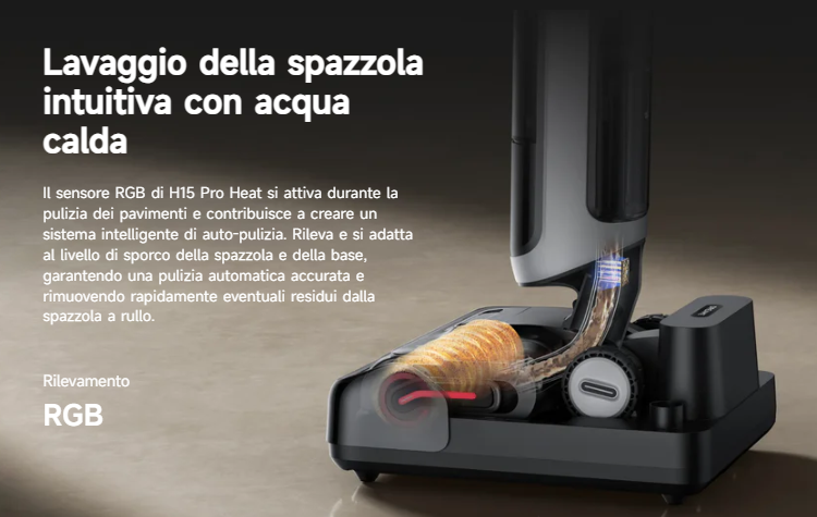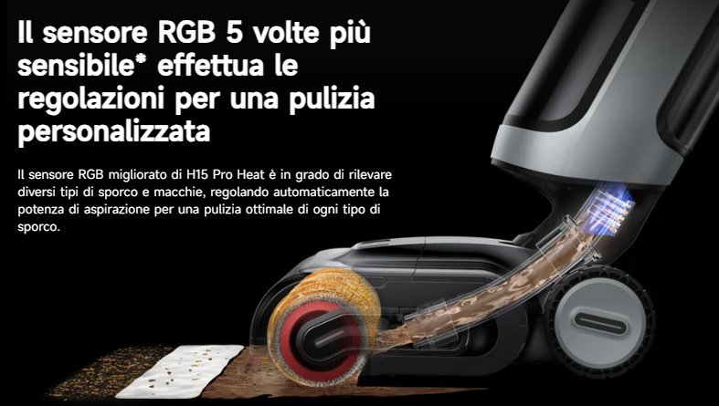 The new RGB sensor, 5 times more sensitive, allows the H15 Pro Heat to “see” and recognize the type of dirt, automatically increasing suction and water on tougher stains or when large amounts of dirt or liquids are present, and reducing intensity on light dust and clean areas to optimize battery life and water consumption.
