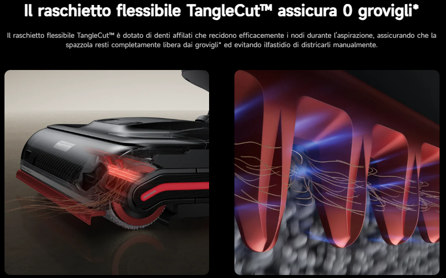 It consists of a flexible scraper with teeth that cut hair and fur during suction, preventing them from wrapping around the roller, while also combing and squeezing the fibers.
