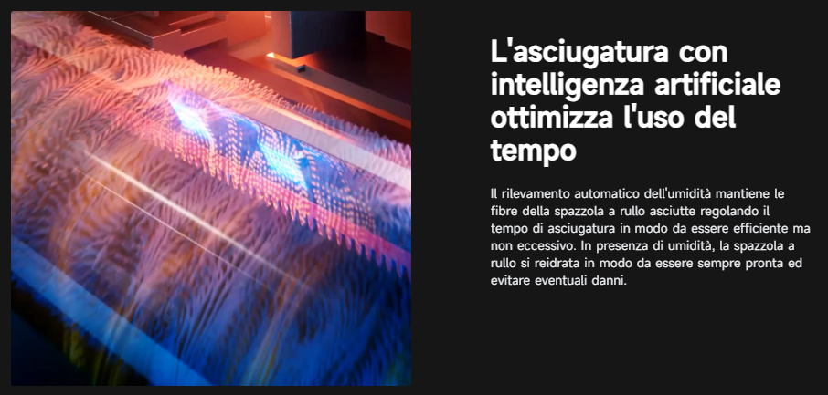 intelligent AI drying with humidity detection: the moisture level of the roller is constantly monitored to start, if enabled, additional drying—ideal even in very humid environments. Fast drying cycle: 5 minutes at 90 °C, or a quiet alternative: 30 minutes at 85 °C at just 63 dB.