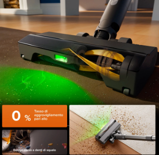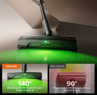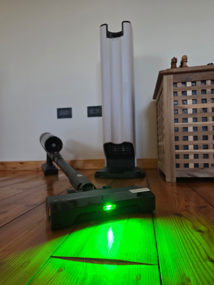 The floor head integrates a green light with a 140° angle that highlights dirt far better than many competitors. This technology is worth explaining properly: it’s not just a simple front light, but illumination designed to reveal fine dust, hair, and pet fur through contrast and micro-shadows. In practice, you can see dirt even where it looked clean to the naked eye. Especially if you clean in the evening or on dark floors, it really helps avoid leaving residue behind.