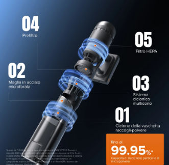 The 5-stage filtration system (plus the one in the dock) should be read in terms of hygiene and air quality. In a well-designed system, each stage acts as a progressive barrier: larger debris first, then fine dust, and finally the densest filter. The reference to 0.3 μm is a classic in domestic filtration, it’s considered a critical size because it’s among the hardest to capture. For the user, this mainly means fewer fine particles released back into the environment, which is especially relevant for people with allergies or pets.