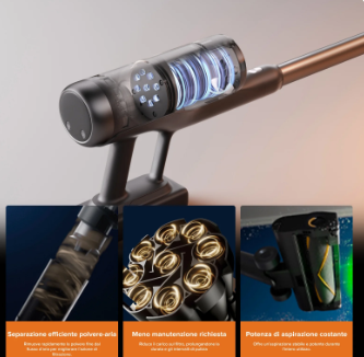 There’s also a detail that’s often underestimated but very important in real-world use: the dock is designed to store the mini motorized brush and the 2-in-1 crevice tool in an orderly, practical, and “clean” way, meaning no accessories left in sight or scattered around the house. The idea is a system that remains compact (84.8 × 28.9 × 28.9 cm), discreet, with accessories close at hand but integrated and invisible. A real advantage if the vacuum lives in a hallway or living area.