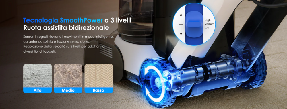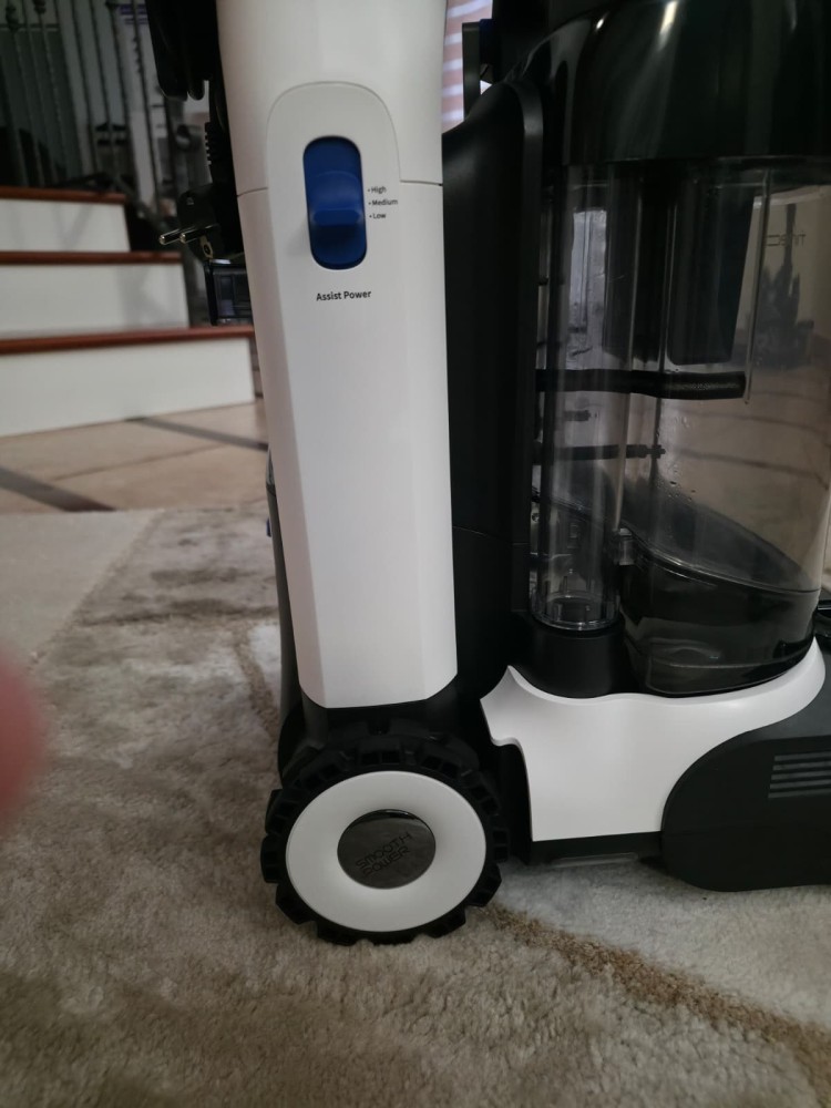 The assistance system, called SmoothPower, integrates motion sensors that detect whether you are pushing or pulling the machine and provide traction in the corresponding direction. It is adjustable on three levels (Low, Medium, High), allowing it to adapt to thin, thick, or multi-layer carpets. This makes a huge difference in real-world use, especially compared to other carpet cleaners that have to be pushed purely “by force.”