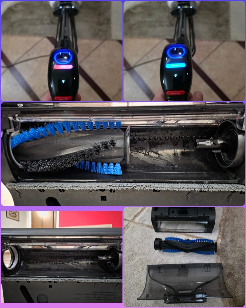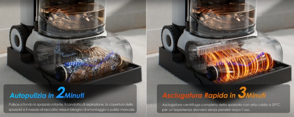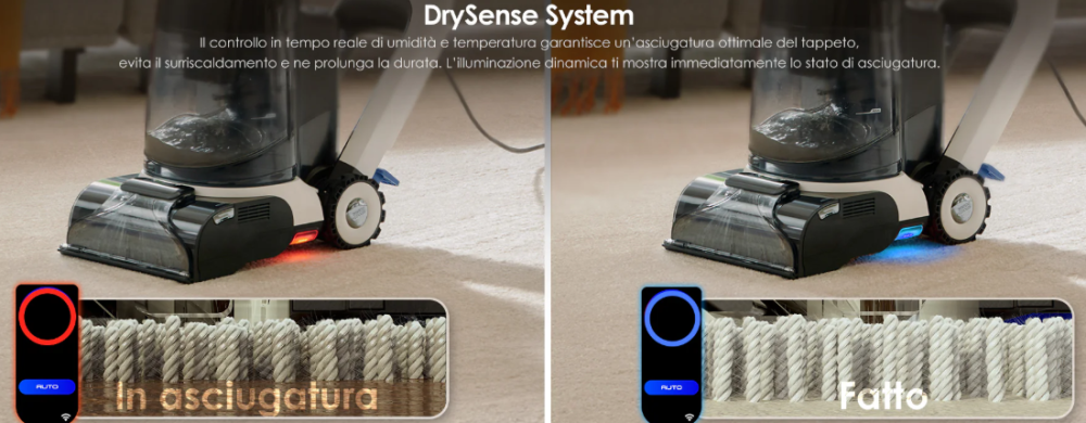 One of the standout features is the DualCore PowerDry mode, which uses hot air up to 75 °C with a PTC heater and suction to remove all excess water and speed up carpet drying. During the drying phase, the DrySense System monitors carpet humidity and temperature in real time and alerts you when the area is sufficiently dry by changing the LED color from red to blue. Drying is not instantaneous, but it drastically reduces time compared to natural air drying and allows the carpet to be reused perfectly dry after just a few hours. It prevents hair and dust from reattaching to damp fabric and also prevents the formation of odors and mold, all without having to hang the carpet up, an operation that is nearly impossible in some environments. It’s an effective function and particularly appreciated in homes with pets and children.