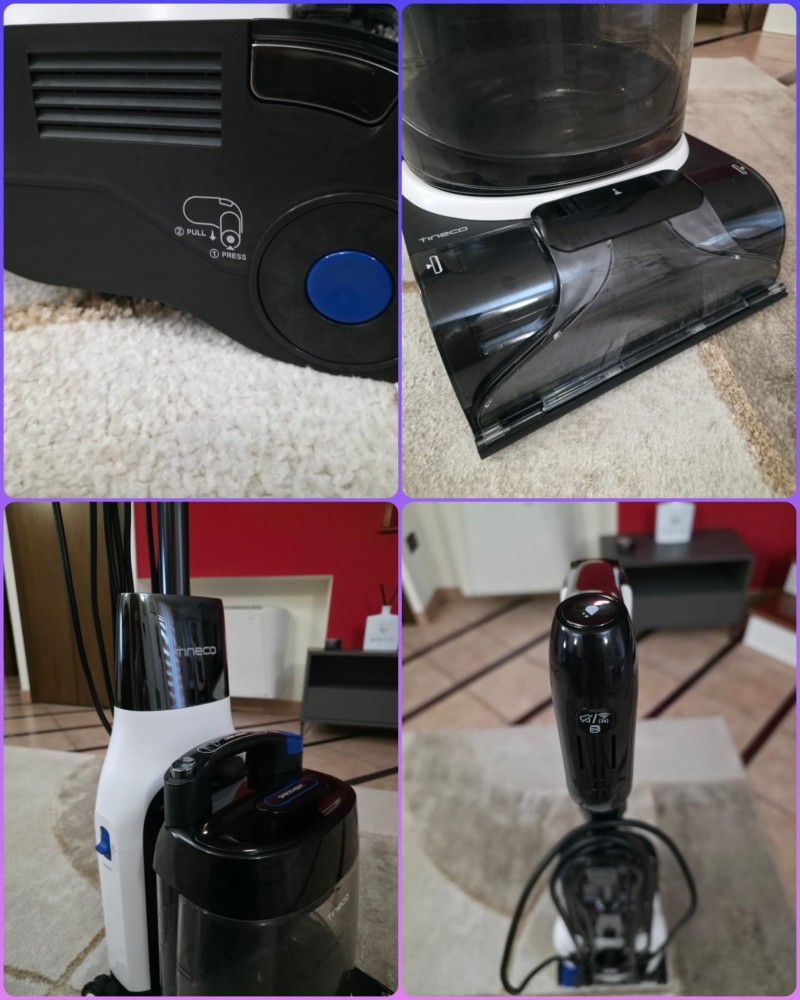 It’s only fair to be clear about a few points. The machine works only when plugged into the power outlet; it has no built-in battery. The tank (2 liters of clean water, 1.7 liters of dirty water) is not large, and if the surfaces to be cleaned are extensive, it needs to be refilled and emptied frequently. Although it is easy to use on carpets, it is not light to move or lift to remove and reposition it on its base. Its weight without water is in fact 9.9 kg, certainly much lighter than a professional carpet cleaner weighing 15–20 kg, but still about twice the weight of a floor washer. It is not designed for sporadic annual use, but for regular cleaning.