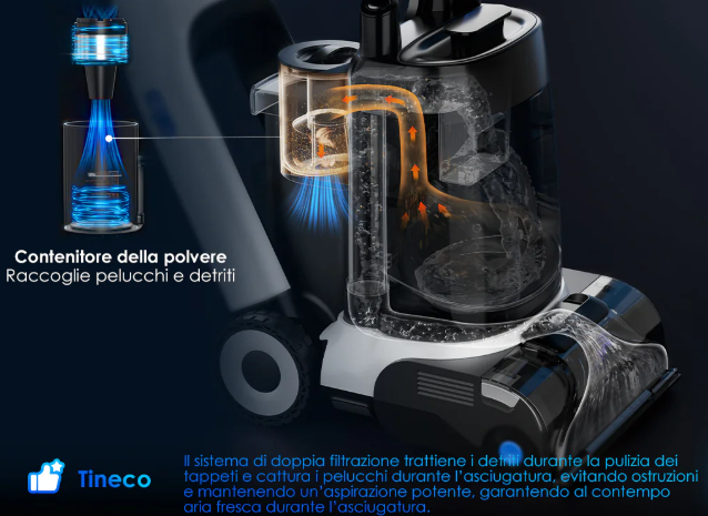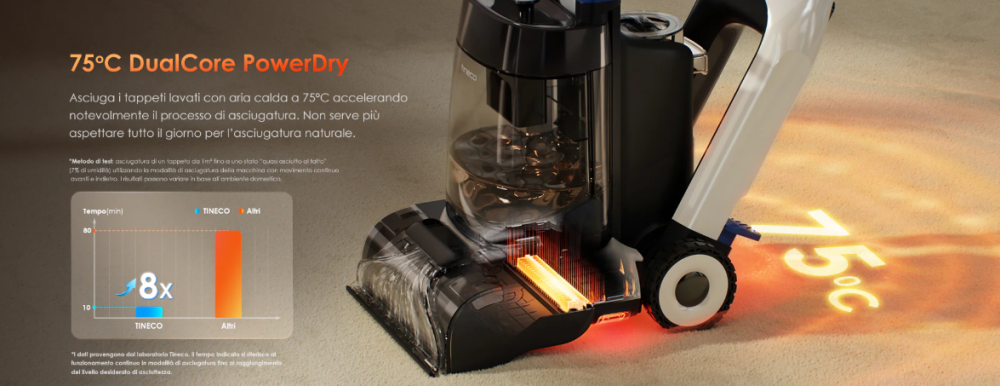 When Tineco talks about PTC heating, it refers to an intelligent, self-regulating heating technology designed to operate safely and stably in contact with fabrics. In practice, the PTC element heats up quickly but, once the ideal temperature is reached, automatically limits power to keep it constant without spikes or overheating. This allows the Carpet One Cruiser to use hot air in a controlled manner during drying, reaching up to about 75 °C without stressing the carpet. The tangible benefit is not just faster drying, but a more uniform and reliable process over time. Hot air helps reduce residual moisture in the fibers, preventing the carpet from staying wet for long and limiting the formation of unpleasant odors. It’s one of those understated but essential technologies, because it makes drying not only more effective but also safer than traditional heating systems.