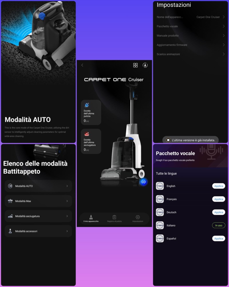 The Tineco Carpet One Cruiser can be connected to the Tineco app, but it’s important to clarify the purpose of this integration right away: it’s not meant to radically change how the machine works or to modify its cleaning parameters. The app plays more of a support and information role. It allows you to consult usage guides, receive maintenance instructions, change the language of voice output, and manage firmware updates when available. There are also some usage statistics and small operational details, useful more for monitoring the machine than for customizing its behavior.