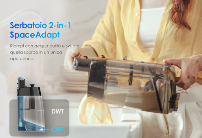 The tank is a single unit but internally divided into clean water on the outside and dirty water in a lower container. This solution eliminates the tank on the handle, lightening the part you have to hold and making use less tiring. In addition, the weight is positioned directly over the brush, increasing pressure and ensuring deeper cleaning.