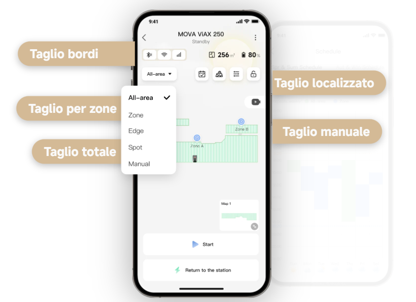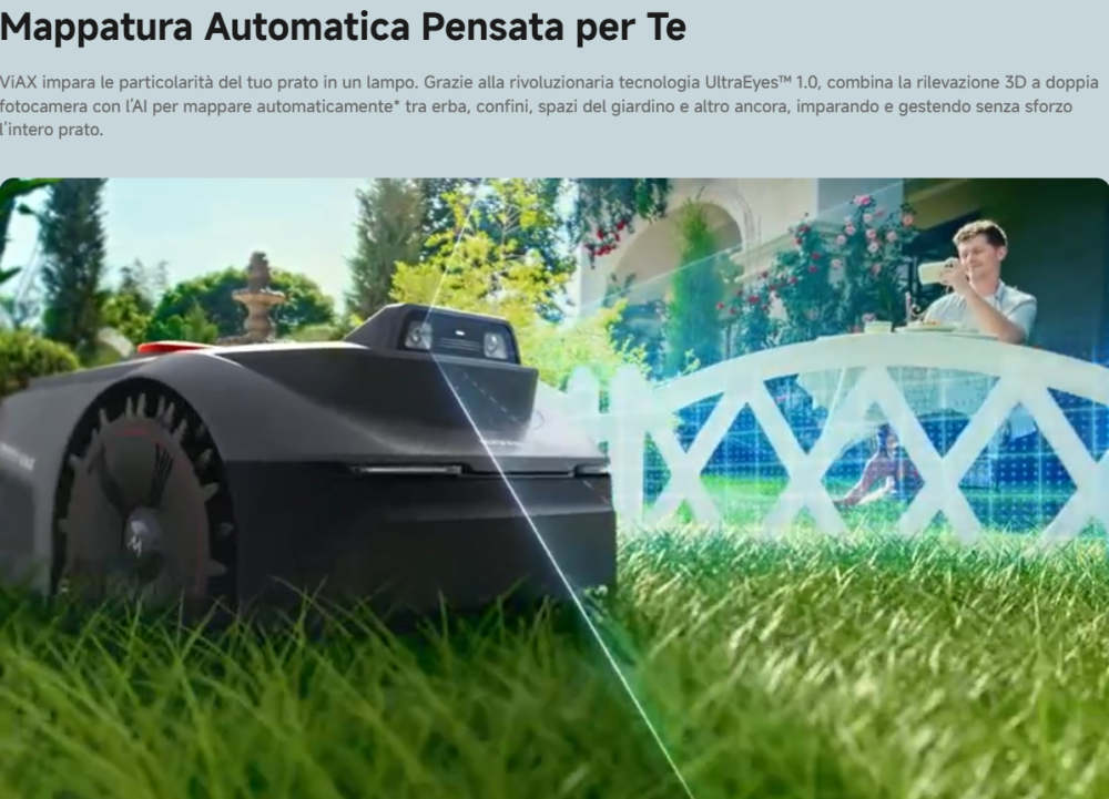 This interpretative capability is most evident in the garden mapping process. The ViAX 250 does not require the user to design everything in advance: it explores the lawn, learns its shape, and builds a coherent map, which can then be refined through the MOVAhome app.