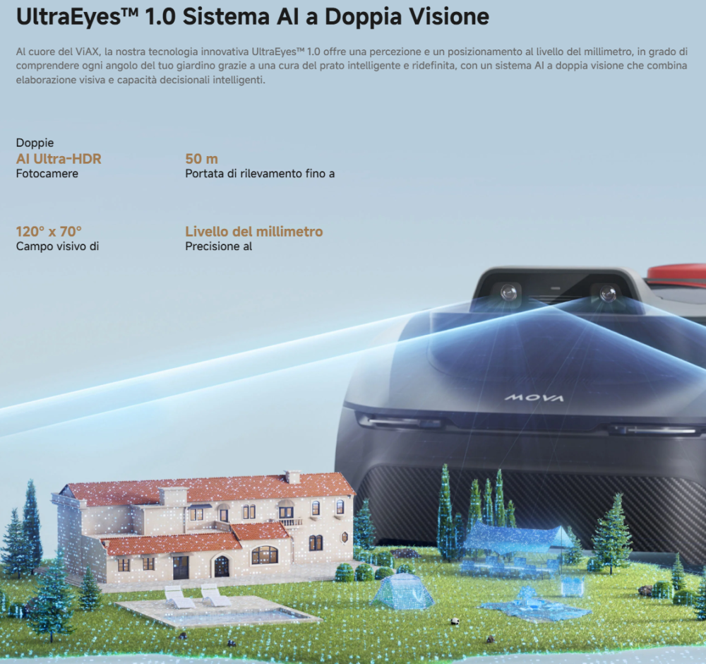 The difference here lies in the technological approach. MOVA built the ViAX 250 entirely around an advanced visual perception system that allows the robot to understand the lawn even before it starts moving.