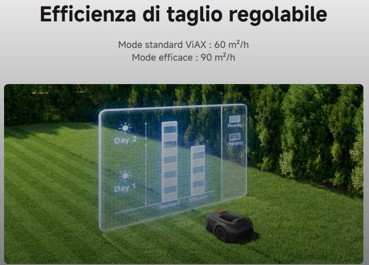Energy management follows the same philosophy of discretion. When the battery approaches a low level, the robot automatically returns to the base, recharges, and resumes mowing exactly where it left off. Charging is fast, about 45 minutes, allowing the ViAX 250 to complete lawn maintenance without endless sessions or prolonged downtime.