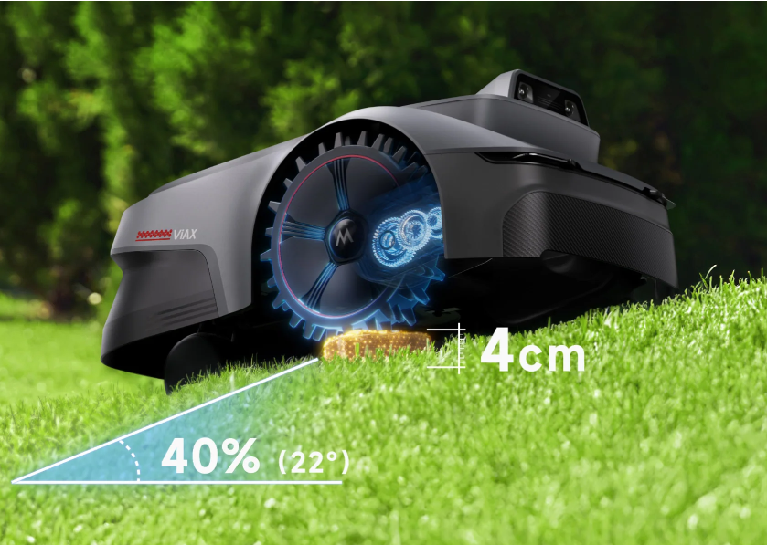 In small gardens, mobility is often more important than pure speed. The ViAX 250 moves confidently in tight spaces, navigating passages as narrow as about 60 cm, and easily handles significant slopes of up to 40% as well as small obstacles up to 4 cm.