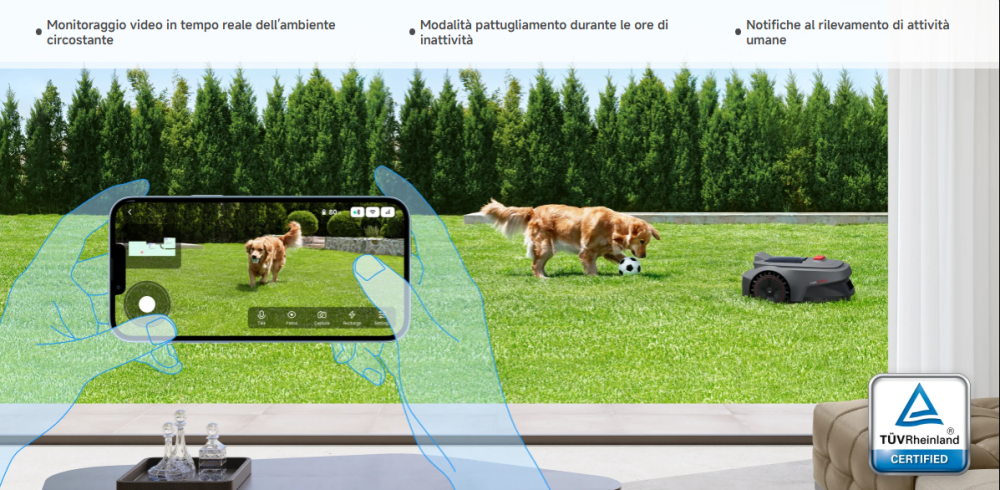 When the ViAX 250 is not mowing, it can enter patrol mode, monitoring the surrounding area and providing a live view directly through the app. This is not a camera for its own sake, but a system designed to report relevant events, such as the presence of people or unusual movement within mapped areas. It is particularly valuable in gardens visible from outside or in second homes, where passive monitoring of outdoor space can be useful.