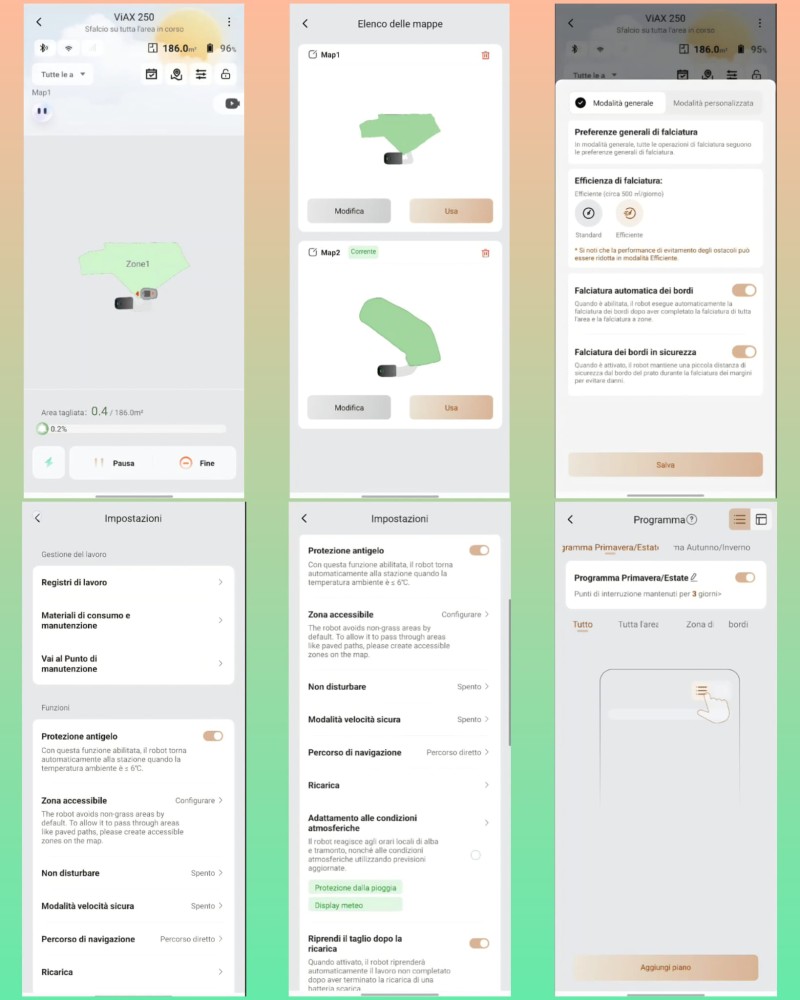 This balance comes from the system’s ability to read the environmental context. The ViAX 250 does not operate according to a rigid schedule: it can monitor local weather conditions and adapt its mowing behavior based on seasonal periods. Through the app, different programs can be set for wetter seasons or drier periods, when grass grows more slowly, helping preserve lawn health.