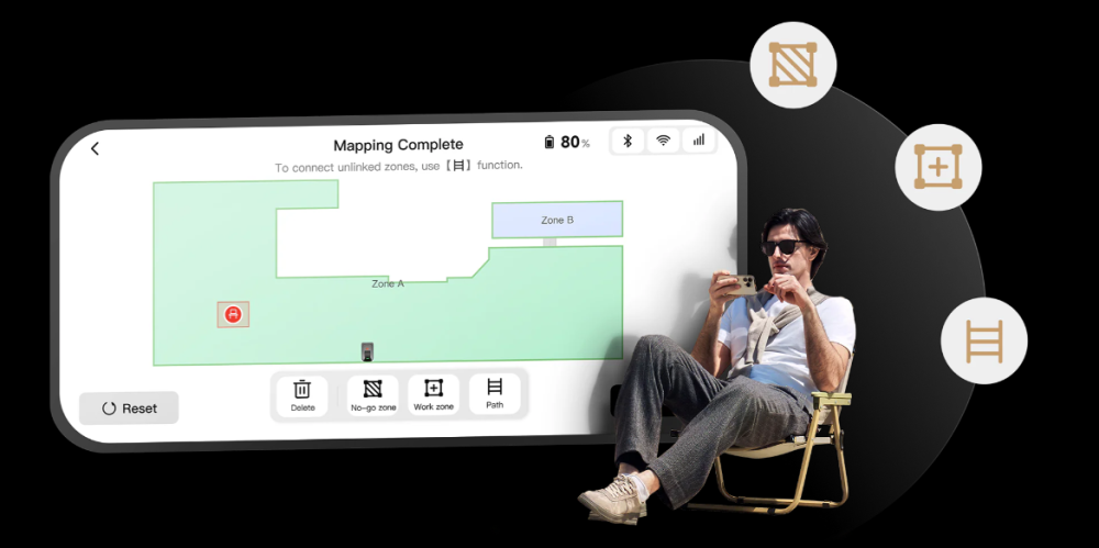 No technical knowledge or special tools are required: everything is managed from the app, where virtual boundaries can be created and working schedules can be set. Multi-zone management is one of the most successful aspects. Different zones can have different schedules, frequencies, and operating modes, allowing the mowing process to be adapted to the real needs of the garden. Specific areas such as flower beds, pools, or decorative spaces can be excluded, and intelligent connections can be created between separate zones, without any physical intervention on the lawn.