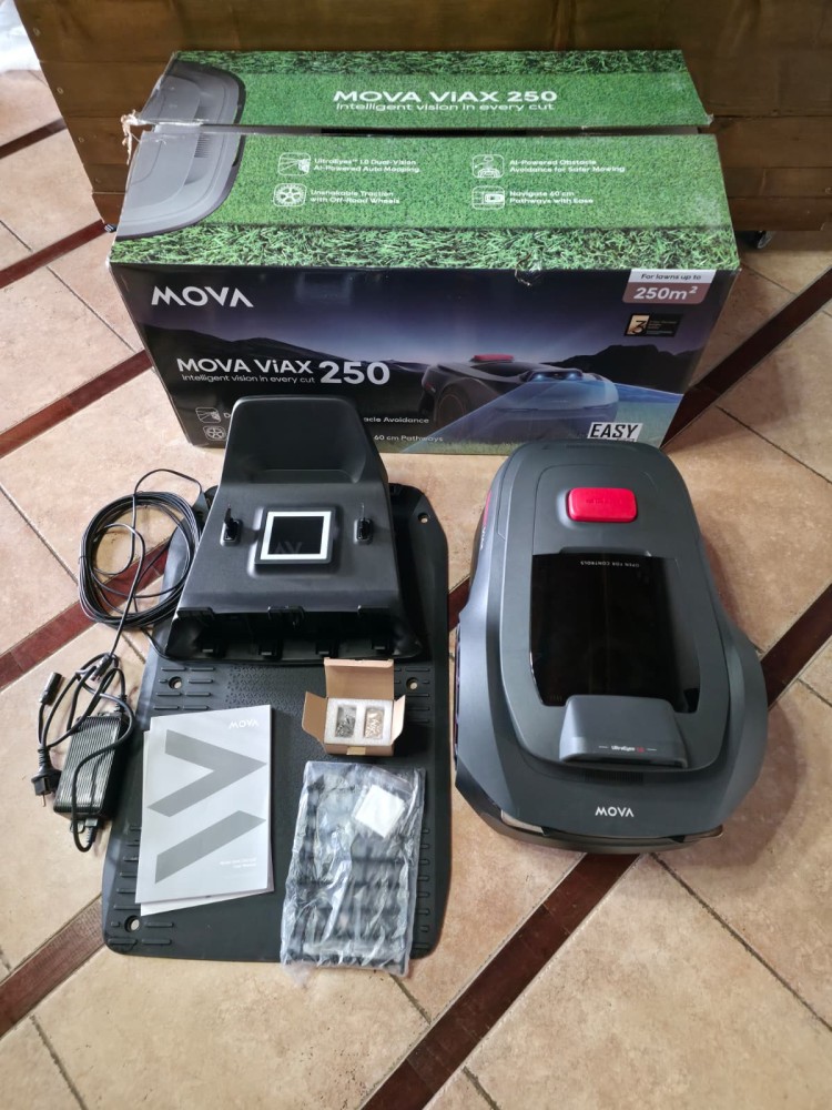 Inside the box, the MOVA ViAX 250 includes everything needed to start using it immediately: the robotic lawn mower itself, the charging station with its power supply, ground stakes and an Allen key for fixing and initial adjustments, as well as a cloth for cleaning the camera glass. It is an essential yet complete kit, consistent with the idea of a product designed to be quick and easy to install and maintain.