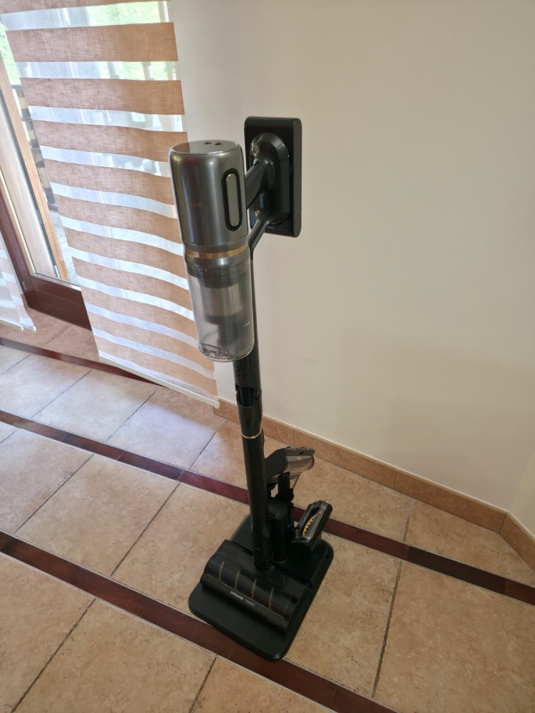 A detail that may seem secondary, but in reality has a huge impact on everyday experience, is the floor charging base. We’re not talking about the classic lightweight plastic support. Here we have a weighted stand, with a significant mass that lets it stay firmly planted on the floor. It doesn’t wobble when you insert or remove the vacuum, and it never feels unstable. It lets the vacuum stand upright without drilling holes in the wall. It’s super convenient for “grab & go” use. Then, and here we inevitably enter the realm of personal taste, some people prefer to hang the vacuum on the wall to optimize every centimeter of space. And that’s understandable. But there are also people, and I definitely put myself in this category, who hate drilling into the wall to install a fixed stand. Between holes, wall plugs, a final position and structural constraints, a wall solution isn’t always the most practical or desirable. In this sense, the V20 Pro’s base is a smart solution: once you put it back, the stick automatically recharges via the integrated contacts; you take it, use it, put it back, and it goes back on charge. The whole setup stays tidy and relatively compact, even though it inevitably takes up more space than a wall hook.