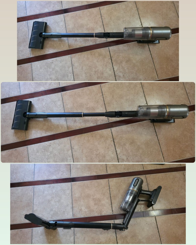 Right from the unboxing, the V20 Pro-A gives the feeling of a premium product. The plastics are solid, the joints are precise, and the assembly is well finished. The flexible central tube that bends to 90°, extendable in four levels, is one of the most successful elements: it lets you easily reach low spaces like under beds and sofas without bending down, and adapt to different heights, improving comfort during everyday use. It’s a solution that, once you try it, truly changes the way you use the vacuum and makes it natural to clean areas that are often neglected purely because they’re inconvenient. The handle is ergonomic and comfortable, even if the choice to place power and mode change on identical upper buttons requires a bit of getting used to; I sometimes found myself confusing the two buttons, and pressing them is a bit awkward with one hand. Since the mode you’ll use practically all the time, because it works wonderfully, is the automatic one, a power on/off trigger would have been more spot-on. The weight, while not low in absolute terms, is very well balanced, with the motor near the handle and the battery balancing the weight: the stick doesn’t “pull” downward and is easy to guide even for long sessions without getting tired.