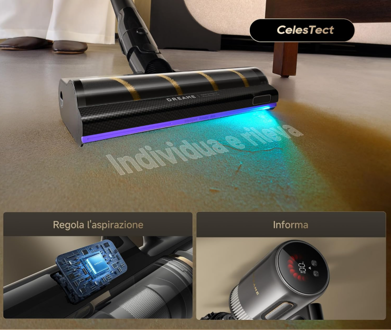 CelesTect™ technology makes dust up to 16 times more visible. The principle behind CelesTect™ is grazing light. Instead of illuminating the floor from above in a diffused way, the light is projected at a very low angle, almost parallel to the surface. Color temperature and light spectrum are designed to emphasize differences between dirt and the surface. This means every dust particle, even the finest, creates a tiny shadow or a micro visual relief. It’s the same effect you notice when the sun is low at dawn or dusk. On top of that is beam management. It’s not a generic “flood” of light, but a controlled blade that increases contrast between floor and dirt. The result is that dust no longer blends into the color or texture of the floor, but stands out with much greater clarity. On floors that look clean it can feel “ruthless”, but it leads to objectively more accurate cleaning. It’s one of those elements that improves awareness of what you’re actually cleaning.