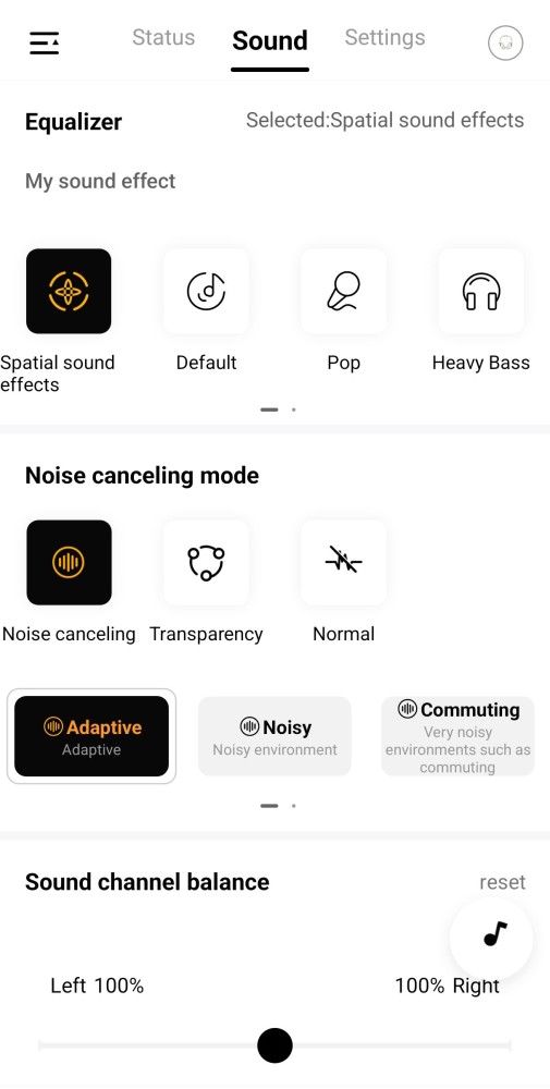 Luego está el apartado que podría ser el más utilizable: “Sound”, el cual nos muestra algunas categorías de selección como: “My sound effect” que es prácticamente para elegir el tipo de sonido que normalmente escuchas, ya sea: Pop, Rock, Classic, Neutral, Spatial sound effects (es el que tengo seleccionado), entre otros.