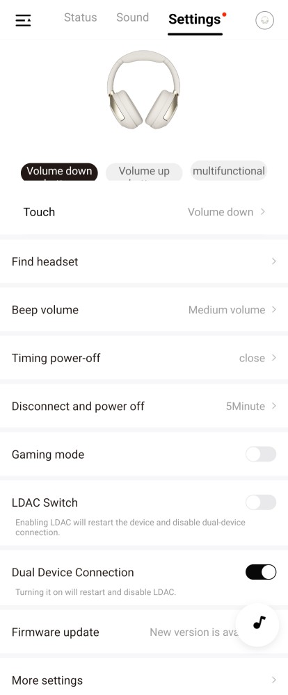 Pero hablemos de su app, tal vez esto además del cable auxiliar es lo más innecesario del mundo, la app es muy sencilla, solamente tienes 2 apartados “útiles” por decirlo de alguna manera; el primero llamado “Status” donde tenemos una representación de cuáles son tus audífonos, el color y el nivel de batería, algo meh 🫤