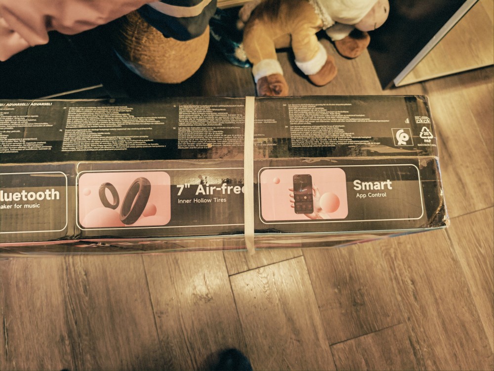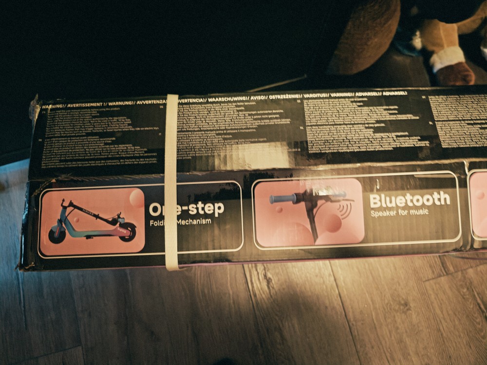 The scooter comes almost ready to use. In the box, you’ll find the scooter, a charger, and a small tool.